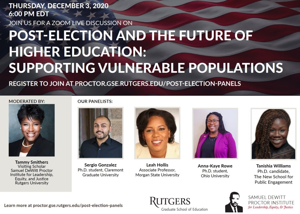 Join The Samuel DeWitt Proctor Institute for Leadership, Equity, and Justice … on Thursday, Dec. 3 for a special post-election discussion! 🇺🇸🗳️ Moderated by @dr.smithers_tammy & featuring Sergio Gonzalez, Anna-Kaye Rowe, Leah Hollis, and Tanisha Williams 🌟