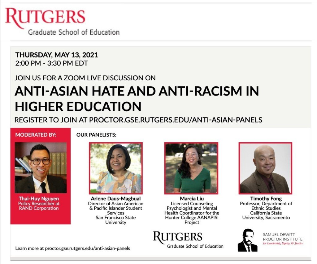 Since the onset of the coronavirus, there has been an increase in anti-Asian violence and hate. This panel discussion will delve into the anti-Asian sentiment and racism in higher education and discuss the social inequalities that Asian Americans have experienced amidst the global pandemic. The event will also share tools for best navigating racialized violence and how to advocate for yourself within academia.